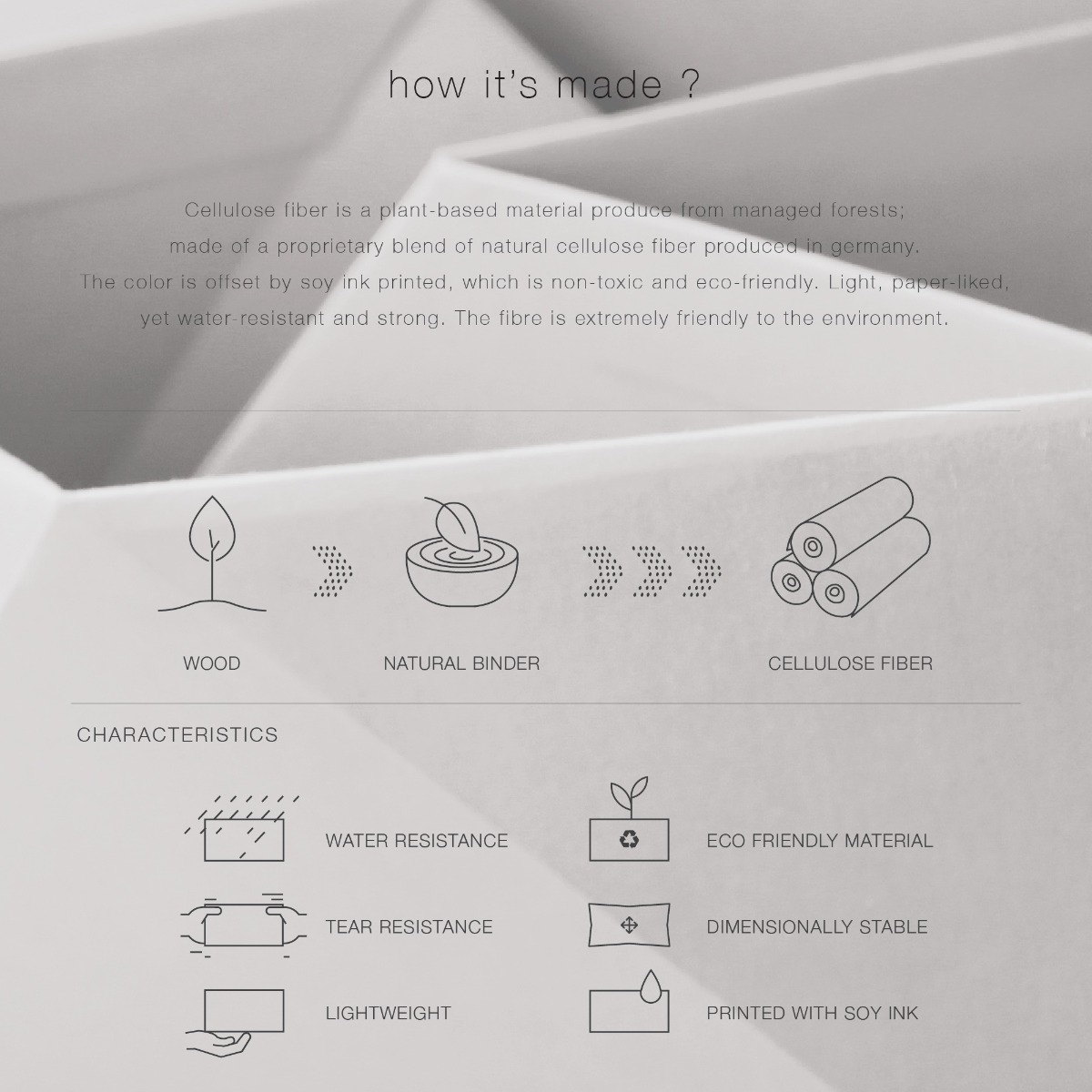 Cellulose fiber is a plant-based material produce from managed forests; made of a proprietary blend of natural cellulose fibre produced in Germany. The color is offset by soy ink printed, which is non-toxic and eco-friendly. Light, paper-liked, yet water-resistant and strong. The FIbre is extremely friendly to the environment.