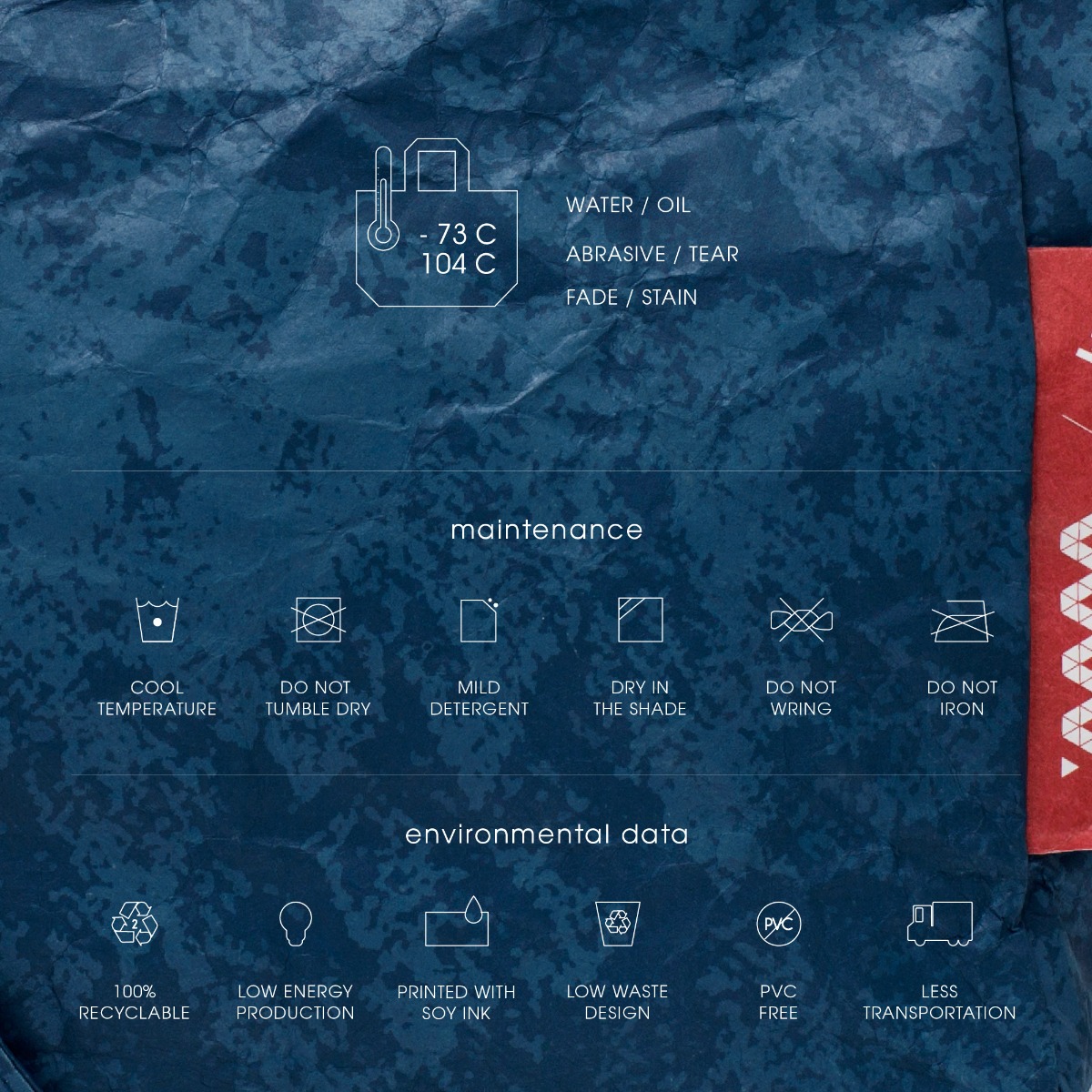 Recyclable spun-bonded material made from 100% high-density polyethylene fibers, Tyvek is paper-liked, yet water-resistant and durability. An innovative material that leads us to the great opportunity to design amazing products. The color is offset by soy ink printed, which is non-toxic and eco-friendly