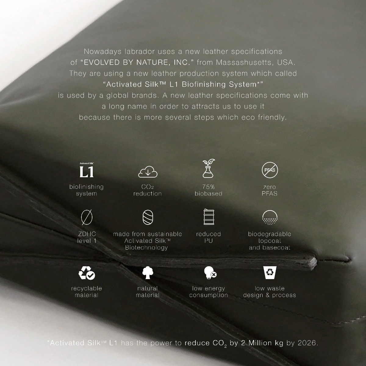 Nowadays labrador uses a new leather specifications of “EVOLVED BY NATURE, INC.” from Massashusetts, USA. They are using a new leather production system which called “Activated Silk™ L1 Biofinishing System*” is used by a global brands. A new leather specifications come with a long name in order to attracts us to use it because there is more several steps which eco friendly.
